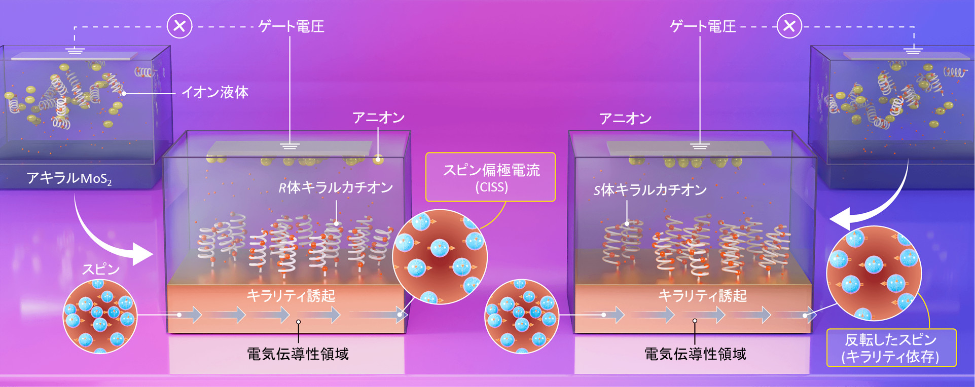 「右手」と「左手」の性質にあたる“キラリティ”は、化学・物理学・生物学における多様な現象を支える基本概念です。これまで、アキラル(非キラル)な物質にキラリティを付与する場合には、キラルな官能基や有機配位子を対象となる分子や金属に化学結合を介して導入することが一般的でした。しかし近年、層状のファンデルワールス化合物にキラル分子を挿入するだけでキラリティ由来の物性が現れる例が報告され、化学結合を介さないキラリティ制御が注目を集めています。本研究では、キラル分子からなるイオン液体(キラルイオン液体)を組み込んだ電気二重層トランジスタを用い、電場を印加してキラル分子を半導体MoS2の表面に吸着させることで、電気伝導性をもつ界面を形成しました。このアキラルな半導体上に形成された電気伝導性界面において、キラリティに依存する電気伝導特性―キラリティ誘起スピン選択性(CISS)や磁気キラル効果―を調べたところ、キラルな電子状態が誘起されていることが確認されました [1]。化学結合を介してキラリティを導入した場合、一度物質を合成するとキラリティを制御することは困難ですが、本手法では電気的にキラル分子の吸着・脱離を可逆的に制御することが可能です。本成果は、電気的キラリティ制御という新しいパラダイムを開く重要な一歩として位置づけられます。この発見を発展させることで、キラル分子イオンの動きと電子の流れを融合させた「キラルイオントロニクス」という新しい技術分野の創出が期待され、将来的にスピントロニクスや光電子デバイス、不斉触媒系など、幅広い分野への応用が見込まれます。